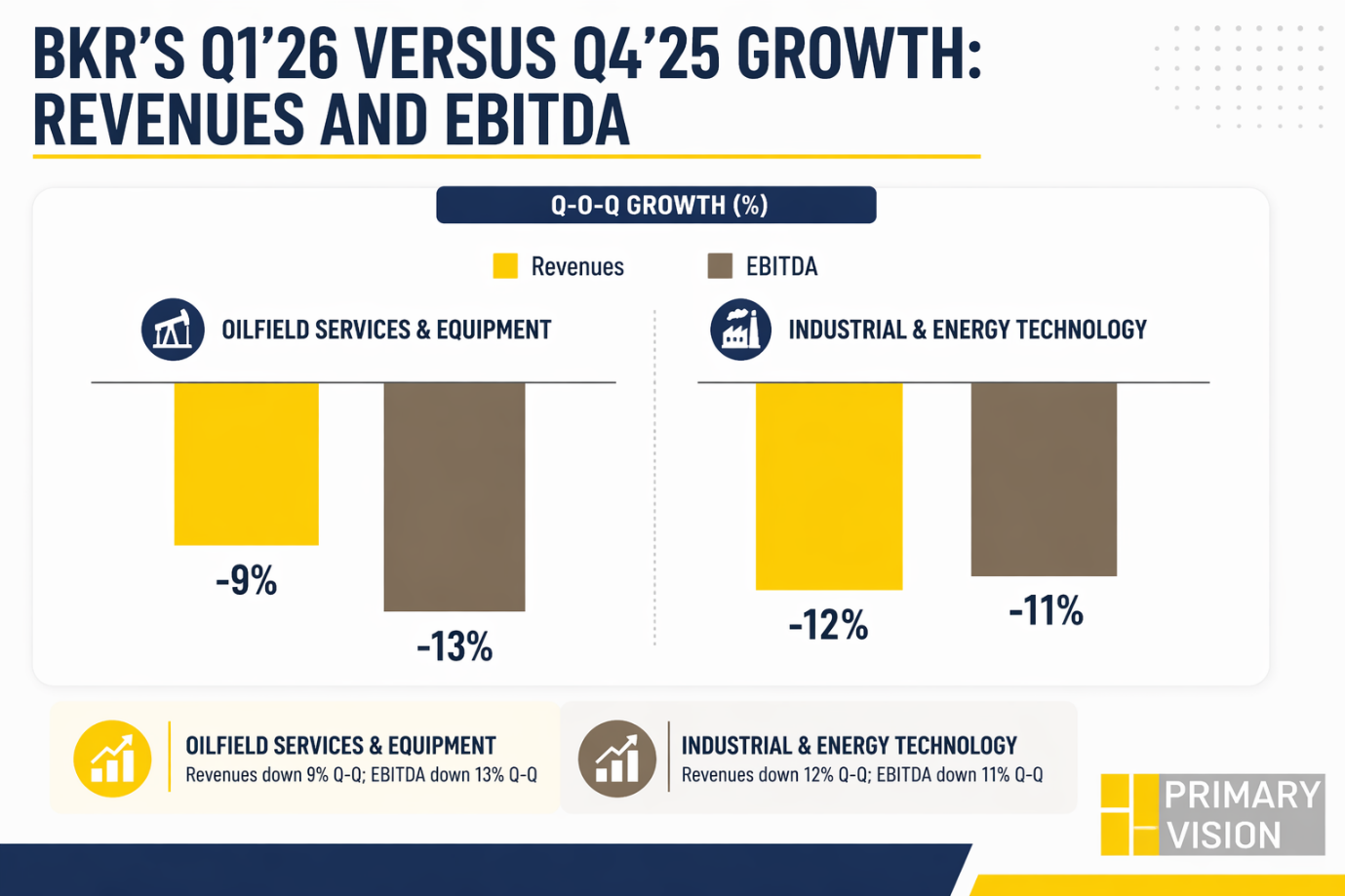 Segment Revenue and EBITDA in Q1: OFSE revenue declined ~9% quarter-over-quarter in Q1, while EBITDA fell ~13%, reflecting lower volumes, unfavorable mix, and the impact of asset dispositions. Geographically, the decline was led by the Middle East/Asia (-17% QoQ), with broader international weakness partially offset by relatively stable North America.