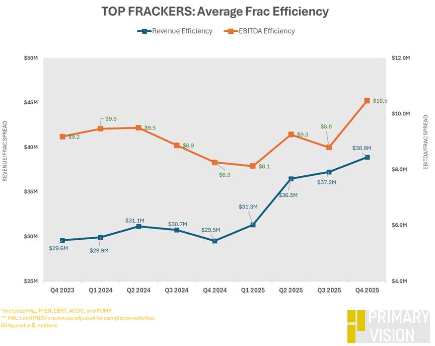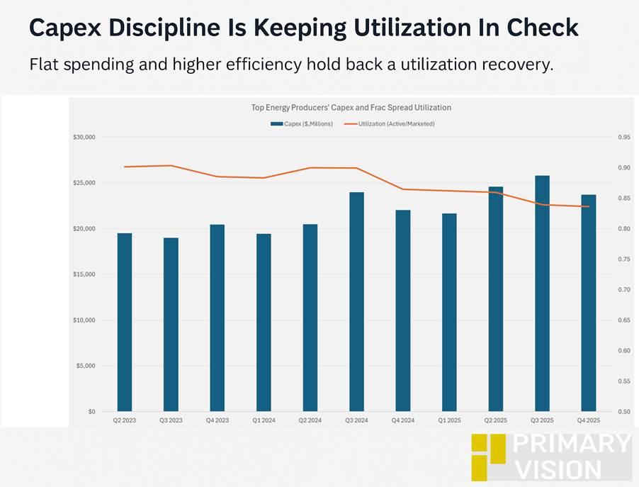 Operator capex discipline is capping utilization. In Q4, top US energy producers’ capex decreased by 8% compared to Q3. E&Ps reduced budgets flat and reallocating within existing programs rather than increasing spending, with any activity uplift pushed into later 2026 and fleets deployed only against contracted visibility. At the same time, efficiency gains—larger fleets, higher intensity, and stable horsepower despite fewer fleets—are allowing more work to be done with the same capital. As a result, utilization is improving but not tightening meaningfully, as incremental demand is absorbed through productivity rather than additional fleet deployment.