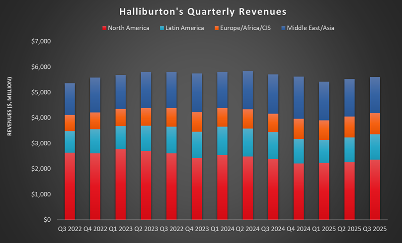 Share Repurchase Amidst Cash Flow Weakness: HAL's cash flow from operations kept on weakening (27% down) in 9M 2025 compared to a year ago. As a result, its FCF decreased by ~39%. Debt-to-equity (0.74x) deteriorated compared to the start of the year. Halliburton repurchased $250 million of common stock during Q3 2025. Year-to-date, total share repurchases reached $750 million.