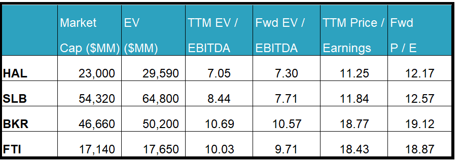 HAL's forward EV/EBITDA multiple expansion versus the adjusted current EV/EBITDA contrasts a decline in the multiple for its peers because the company's EBITDA is expected to decline versus a rise in EBITDA for its peers in the next four quarters. This typically results in a much lower EV/EBITDA multiple than peers. The stock's EV/EBITDA multiple is lower than its peers' (SLB, BKR, and FTI) average. So, the stock is reasonably valued, with a negative bias, versus its peers.