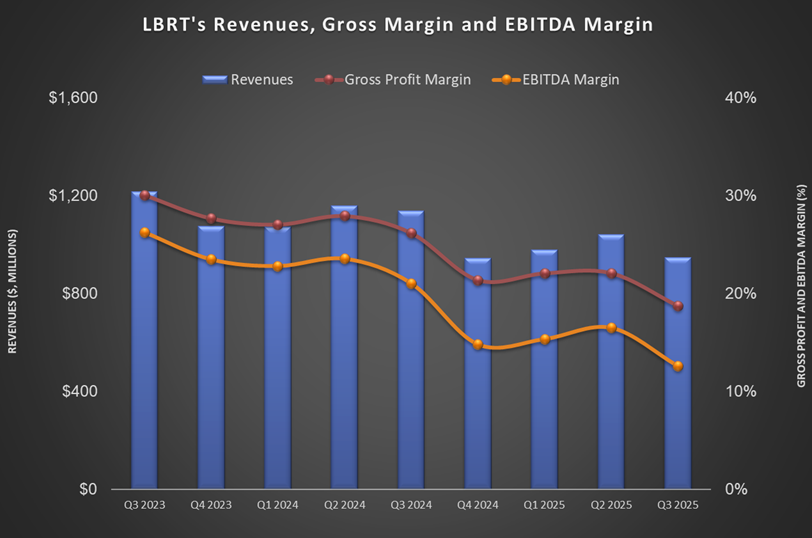 LBRT's revenues decreased by 9.1% quarter-over-quarter in Q3, while its adjusted EBITDA dipped by 29%. Its net income fell even more sharply, by 39%, in Q3 after surging remarkably in Q1. The company's debt-to-equity ratio deteriorated to 0.12x as of September 30, compared to 0.08x in the previous quarter. Despite the strain in the environment, it has recently increased its quarterly cash dividend by 13%.