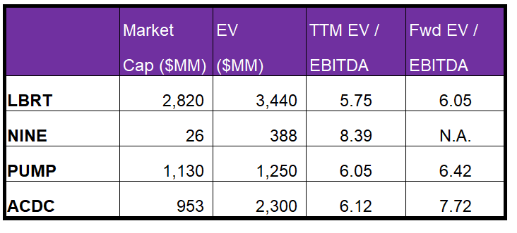 LBRT's forward EV/EBITDA multiple expansion versus the current EV/EBITDA is lower than its peers because the company's EBITDA is expected to decline less sharply than its peers in the next four quarters. This typically results in a higher EV/EBITDA multiple than peers. The stock's EV/EBITDA multiple is lower than its peers' (NINE, PUMP, and ACDC) average of 6.9x. So, the stock appears to be undervalued compared to its peers.