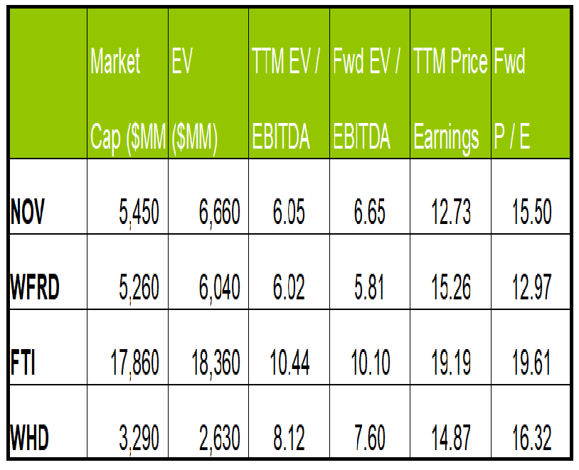NOV's forward EV/EBITDA multiple expansion versus the current EV/EBITDA contrasts with its peers because its EBITDA is expected to decrease compared to a rise in EBITDA for its peers in the next year. This typically results in a much lower EV/EBITDA multiple than its peers. The stock's EV/EBITDA multiple is lower than its peers' (CHX, FTI, and WHD) average. So, the stock is reasonably valued, with a negative bias, compared to its peers.