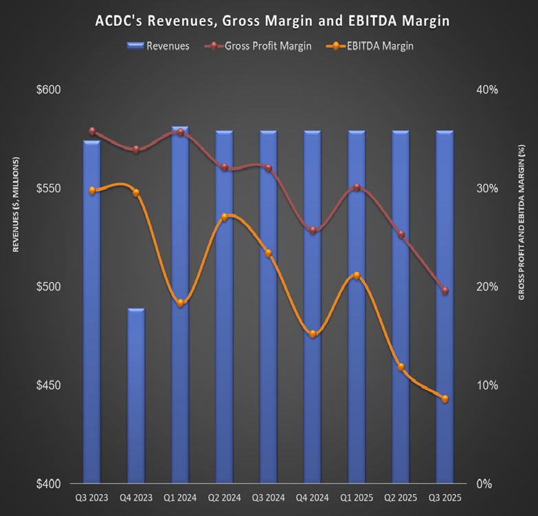 ACDC is currently trading at an EV/EBITDA multiple of 7x. Based on sell-side analysts' EBITDA estimates, the forward EV/EBITDA multiple is 6.9x.