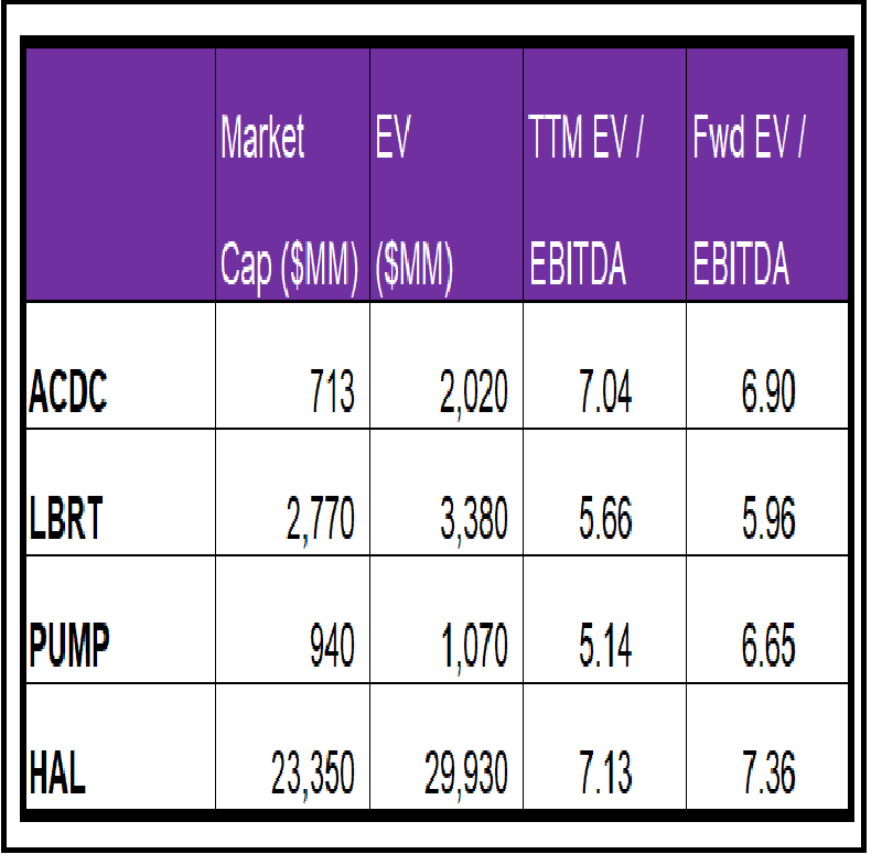 ACDC's forward EV/EBITDA multiple contraction versus the current EV/EBITDA contrasts with its peers because its EBITDA is expected to increase, while its peers’ EBITDA is expected to decrease in the next year. This typically results in a a much lower EV/EBITDA multiple than its peers. The stock's EV/EBITDA multiple is higher than its peers' (LBRT, PUMP, and HAL) average (6x). So, the stock is overvalued compared to its peers.
