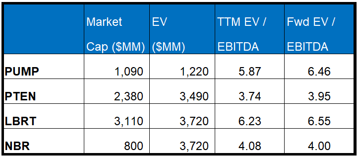 PUMP's forward EV/EBITDA multiple expansion versus the current EV/EBITDA is steeper than its peers ' because its EBITDA is expected to decrease more sharply than its peers over the next year. This typically results in a lower EV/EBITDA multiple than its peers. The stock's EV/EBITDA multiple is higher than its peers' (PTEN, LBRT, and NBR) average. So, the stock is overvalued compared to its peers.