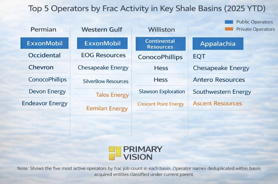 This analysis does not attempt to estimate total basin market share. It focuses on the most active operators in each basin to compare completion intensity with production weight within a defined peer group. Frac job counts reflect 2025 YTD activity for leading operators. Production figures use 2024 basin-level estimates derived from company disclosures and third-party synthesis where necessary. The objective is to evaluate behavioral differences between large public operators and private operators operating within the same tier, rather than to model total basin outcomes.