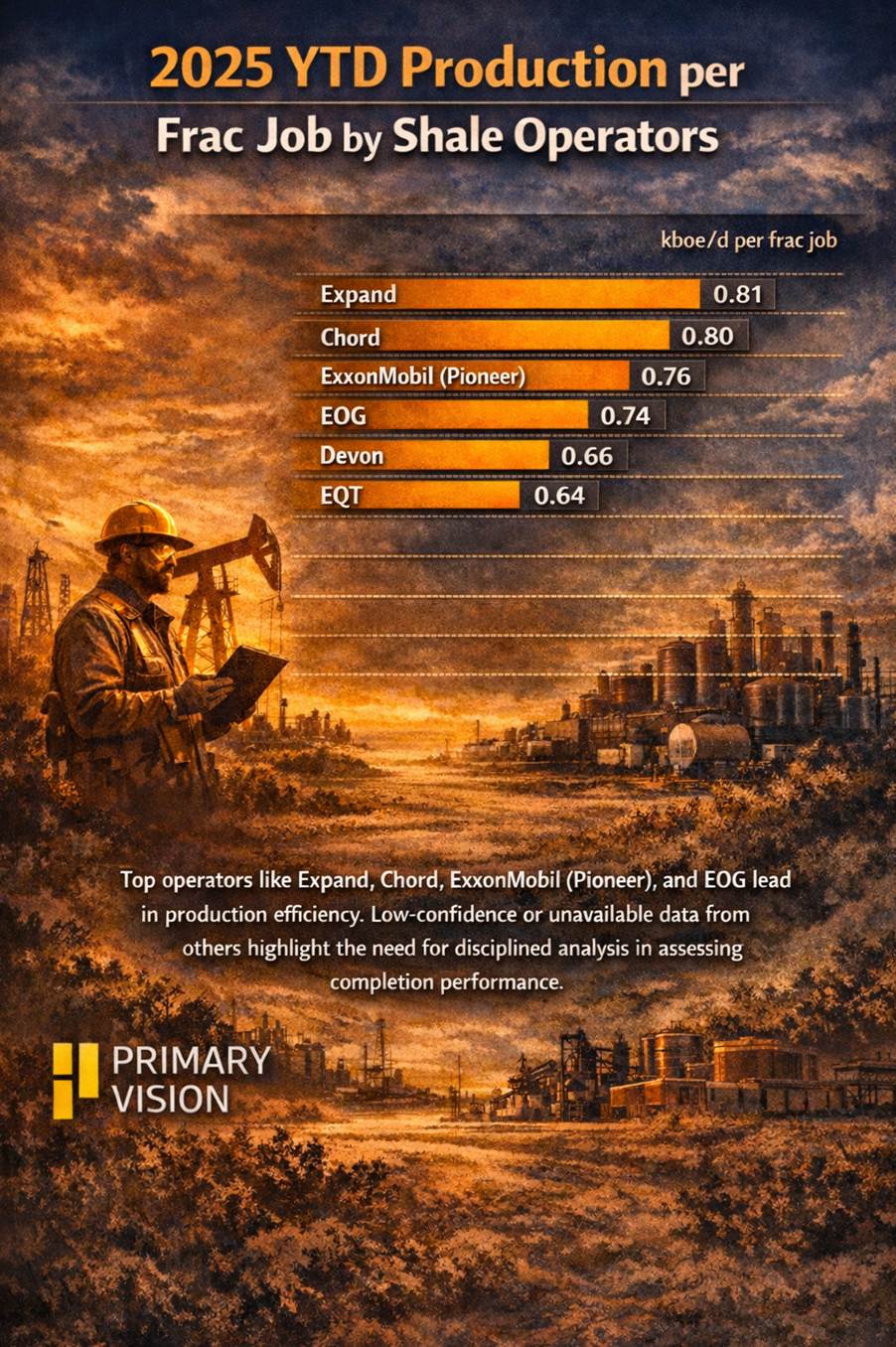 Productivity per frac job shows meaningful dispersion across operators. Expand, Chord, ExxonMobil (Pioneer), and EOG consistently convert completions into higher production, signaling stronger execution rather than just scale.