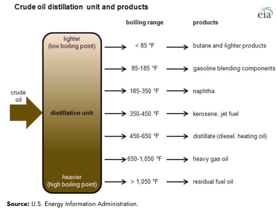 Crude oil comes out of the ground as a raw, unusable mixture. Before it becomes anything useful, it has to be processed at a refinery. The refinery heats the crude oil and at different temperature ranges, different products separate out gasoline comes off first, then jet fuel in the middle, then diesel, then heavier products like heating oil and asphalt toward the bottom.