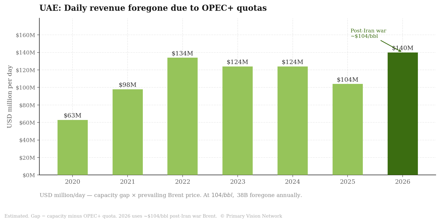 But the economics had been building toward this moment long before the first missile flew. ADNOC spent years expanding capacity toward 5 million barrels per day while OPEC quotas kept actual production pinned at 3.4 to 3.7 million. That gap — roughly 1 to 1.3 million barrels per day of deliverable production sitting idle by policy decree — represents somewhere around $100 million a day in foregone revenue at current prices. OPEC's concession was a grudging 300,000 bpd relief valve, phased in slowly. Abu Dhabi wanted the full tap open. With a fiscal breakeven now below $60 a barrel and Brent trading above $100 on Iran war risk premiums, the math for staying inside the cartel simply stopped making sense.