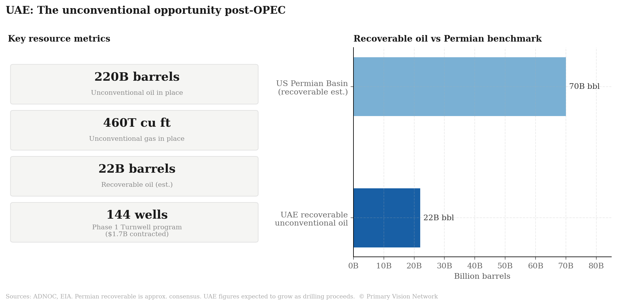 The question that should interest the frac industry most is what Abu Dhabi does next with its unconventional resources. The numbers are staggering — Abu Dhabi holds an estimated 220 billion barrels of unconventional oil and 460 trillion cubic feet of unconventional gas in place. ADNOC has already produced the UAE's first gas from an unconventional reservoir, deploying advanced fracking techniques through its Turnwell joint venture with SLB and Patterson-UTI — with the $1.7 billion Phase 1 contract covering 144 wells described as just the beginning of a campaign that could run to thousands. EOG Resources has also been awarded a concession for nearly 900,000 acres in the Al Dhafra region, with horizontal wells already drilled and oil tested to surface. Inside OPEC, aggressive unconventional development would have complicated quota negotiations and drawn political friction. Outside it, there is no ceiling.