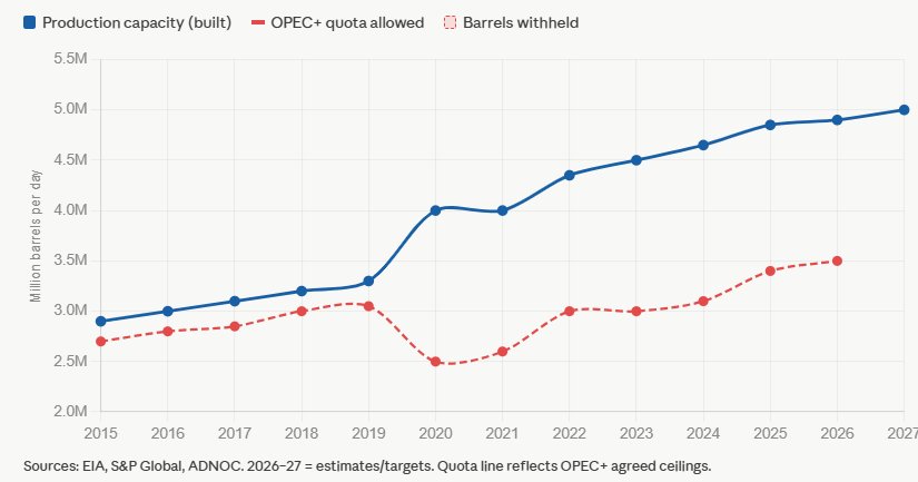 What follows is worth watching closely. Free of quota constraints, ADNOC can now pursue its 5 million bpd target on its own timeline and its own terms. The revenue upside is significant. The damage to OPEC is structural — after Qatar in 2019 and Angola in 2024, the group is increasingly a club of constrained producers and declining members rather than the swing-capacity engine it once was.