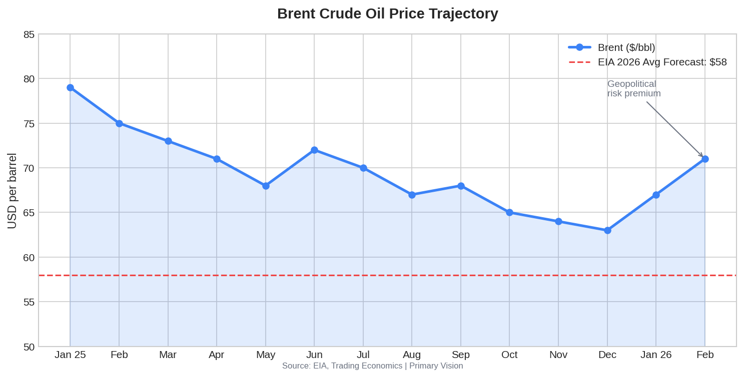 Thinking through scenarios, the range of potential outcomes is fairly wide. In a base case with no major escalation, continued oversupply, and China maintaining its stockpiling pace, Brent would likely settle in the $55-62 range through the year—broadly consistent with EIA projections. If sanctions tighten further or a supply disruption removes 1-2 million barrels per day from the market, prices could move into the $70-80 range, though strategic reserve releases might offset some of the impact. A major escalation involving the Strait of Hormuz—a scenario we have explored in previous articles—would be a different situation entirely, with prices potentially reaching $90-110 or higher.