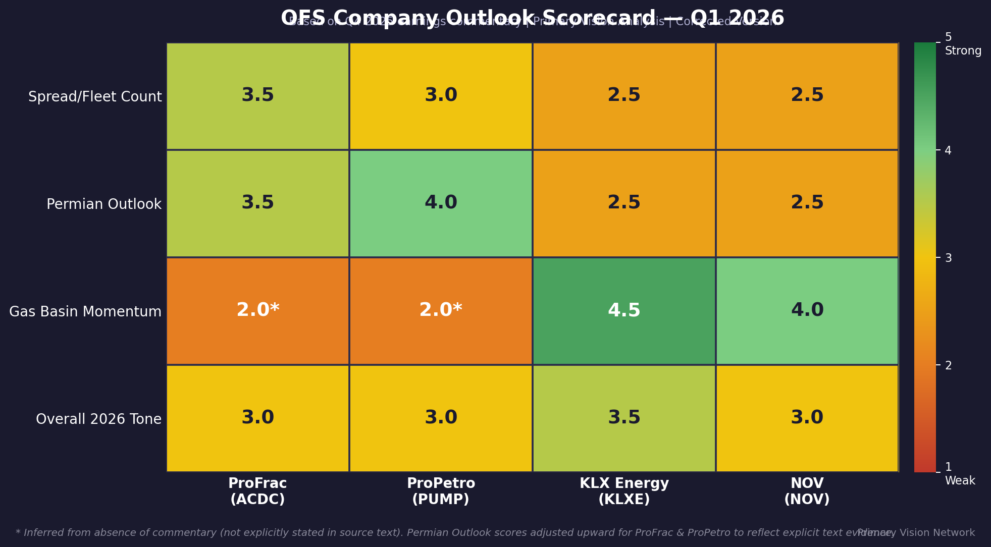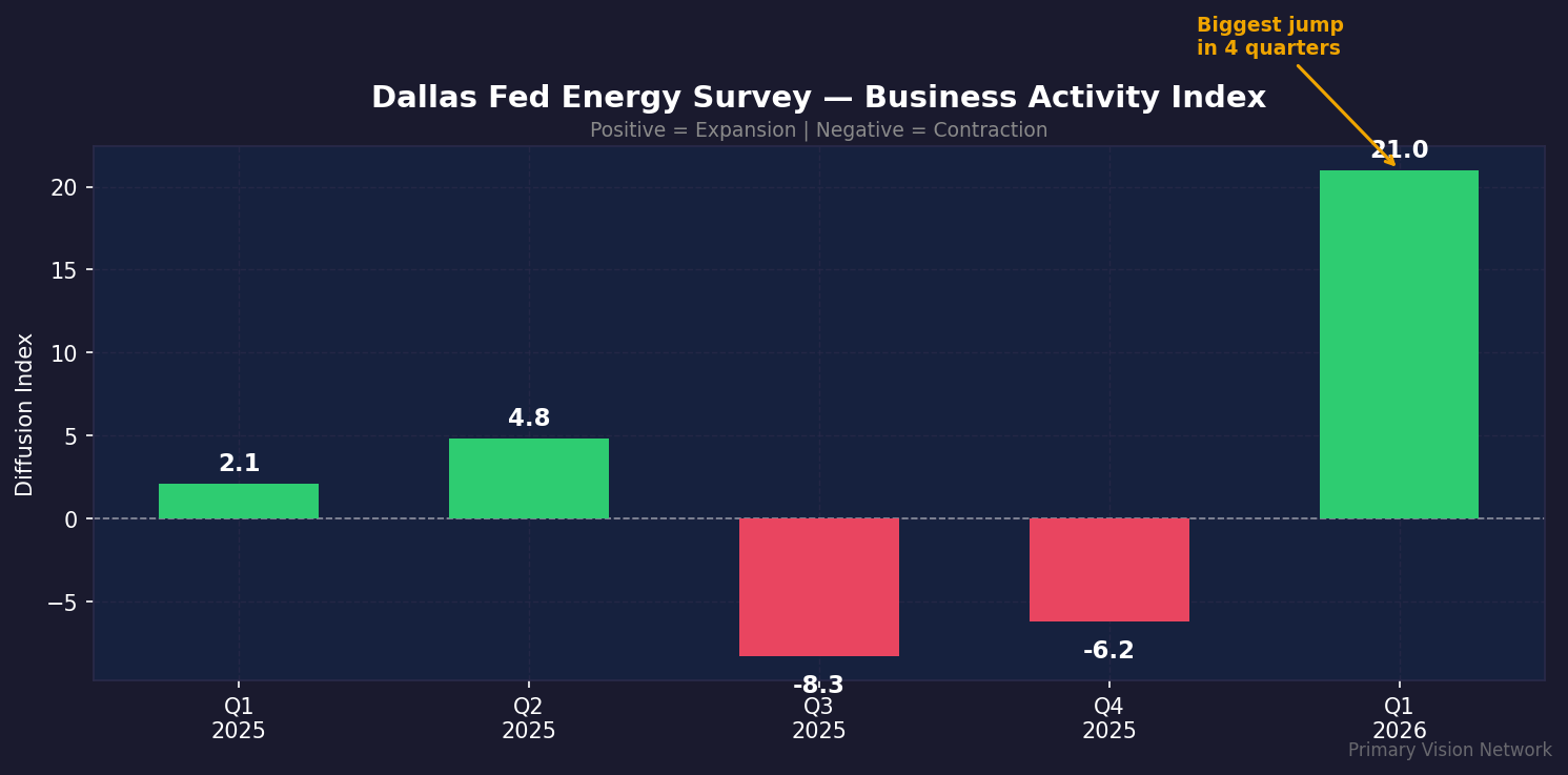 The Q1 2026 Dallas Fed Energy Survey arrived last week with a message that will surprise no one who has been following Primary Vision's completion data closely. The business activity index swung from -6.2 to +21.0, company outlooks flipped from -15.2 to +32.2, and oilfield services equipment utilization jumped from -12.2 to +30.2. For anyone tracking frac spreads and frac job counts through Q1, none of this is shocking. The recovery that Primary Vision's data has been signaling for weeks is now showing up in executive sentiment as well and that alignment between ground-level activity data and boardroom confidence is itself an important signal.