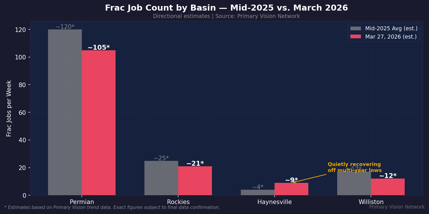 Perhaps the most underappreciated story in both the survey data and Primary Vision's basin-level trends is what is happening in gas. The Dallas Fed survey, shaped heavily by the oil price shock psychology of the survey period, gave relatively little attention to gas-directed activity. But Primary Vision's data shows Haynesville frac job count recovering meaningfully from the multi-year lows of late 2025, with the basin trending back toward 8-9 jobs per week and showing clear directional momentum. This aligns precisely with what KLX Energy Services reported — gas-directed basins were the standout performers in Q1, with dry gas revenue rising both sequentially and year-over-year in the Northeast Mid-Con. NOV similarly flagged stronger gas basins as a meaningful offset to softer oil-directed markets. With LNG export demand growing, data center power consumption rising, and natural gas fundamentals quietly strengthening, Haynesville's recovery deserves more attention than it is currently receiving in the broader industry conversation.