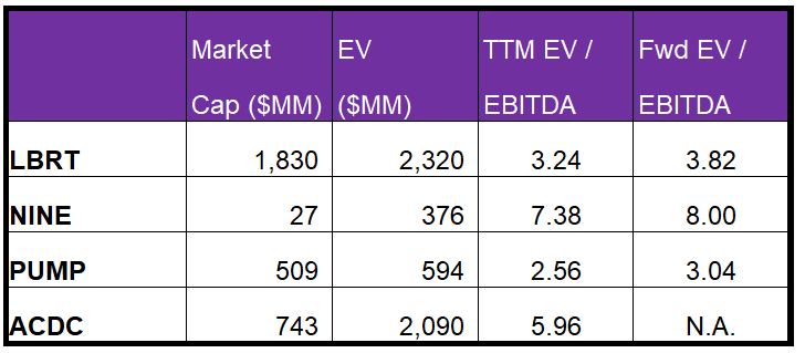 LBRT's forward EV/EBITDA multiple expansion versus the current EV/EBITDA is higher than its peers because the company's EBITDA is expected to decline more sharply than its peers in the next four quarters. This typically results in a lower EV/EBITDA multiple than peers. The stock's EV/EBITDA multiple is lower than its peers' (NINE, PUMP, and ACDC) average of 5.3x. So, the stock is reasonably valued compared to its peers.