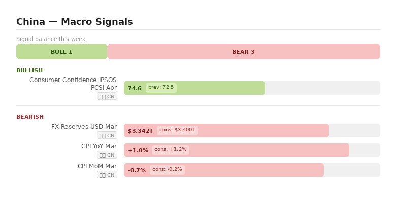 China's data this week tells a single clear story: prices are falling, and the government is running out of reserves trying to stop the currency from falling with them. CPI came in at +1.0% year-on-year in March, below the 1.2% forecast. The monthly number was −0.7%, much worse than the −0.2% expected. When prices fall month after month, businesses delay investment and consumers delay purchases — both waiting for things to get cheaper. That cycle is hard to break. The FX reserve number is the one to watch. China's reserves fell to $3.342 trillion against a $3.400 trillion forecast and a $3.428 trillion prior. That $86 billion miss versus expectations in a single month points to capital leaving the country, the PBOC spending reserves to prop up the renminbi, or both. Neither is good. A country burning through reserves to defend its currency is a country under pressure it cannot fully acknowledge publicly.