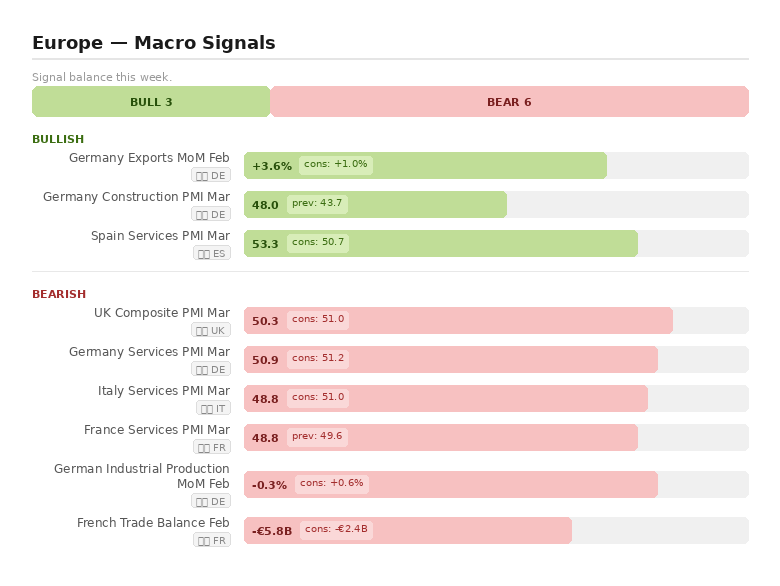 France's trade deficit blowing out to −€5.8B against a −€2.4B forecast is the sharpest data point of the week for Europe. France is importing more and exporting less at the same time, a combination that drains growth. Spain at 53.3 services PMI remains the exception, but one strong outlier does not change the direction of the bloc.