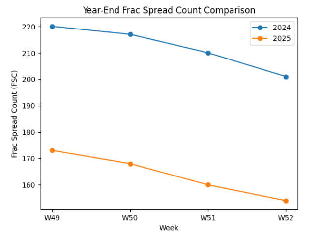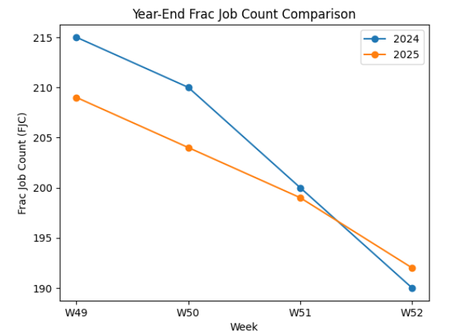 For my last MMV of 2025, I will once again start with the latest FSC and FJC. The Frac Spread Count came in at 154, falling by 6 on a week-over-week basis, while the Frac Job Count was 192 after a drop of 7 this week. Now let’s break it down.