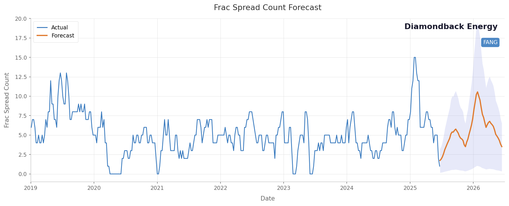 Diamondback Energy presents a different picture. The company's 2026 plan targets production of 500–510 MBO/d with cash capex of $3.6–$3.9 billion, holding activity roughly flat versus Q4 2025. That flat activity guidance is the critical phrase for interpreting our spread count forecast. The pronounced winter surge the model identifies — mean counts rising to approximately 8–10.6 in the late December 2025 to late January 2026 window — captures the post-Q2 2025 recovery as Diamondback rebuilt its completion pace after cutting a crew mid-year. Capital spending increased in Q4 2025 within the company's guided range, and management stated explicitly that it expects to maintain those activity levels throughout 2026. The subsequent normalization toward 3–6 spreads per week by mid-2026 is consistent with that steady-state flat posture. The wide confidence bands reflect that Diamondback's concentrated Permian position makes its spread count sensitive to any macro shift — a price move or a budget revision translates quickly into observable changes at the field level.