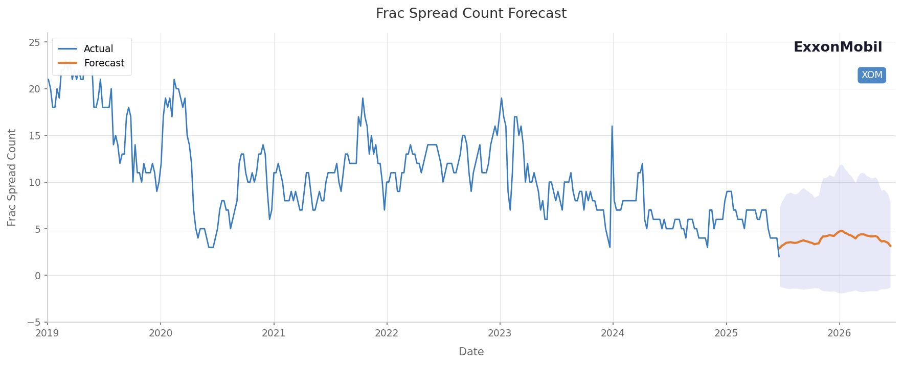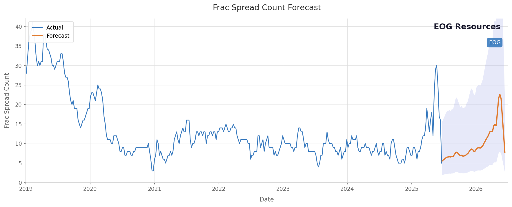 EOG Resources enters this period as the most operationally active of the three. The company plans to complete 585 net wells across its portfolio in 2026, running approximately 24 rigs and 10 completion crews, with activity split roughly evenly between the first and second halves of the year. That is a step down from the 645 net wells completed in each of the prior two years, but it comes alongside meaningful cost reduction — well costs in the Delaware Basin have fallen roughly 20% versus 2023 levels, bringing costs to at or below $725 per foot. Our Frac Spread Count forecast reflects this posture directly: a moderate baseline with episodic high-intensity windows rather than a sustained ramp. The wide 90% prediction bands, with upper bounds reaching into the low 40s in isolated weeks, capture the reality that EOG's campaign-style completion schedule creates bursts of demand that are difficult to predict at weekly resolution. Management has also signaled that much of the operational improvement in 2026 will come from refined completion techniques and longer laterals rather than a raw increase in spread count, which explains why the aggregate forecast does not show a dramatic step-change upward.