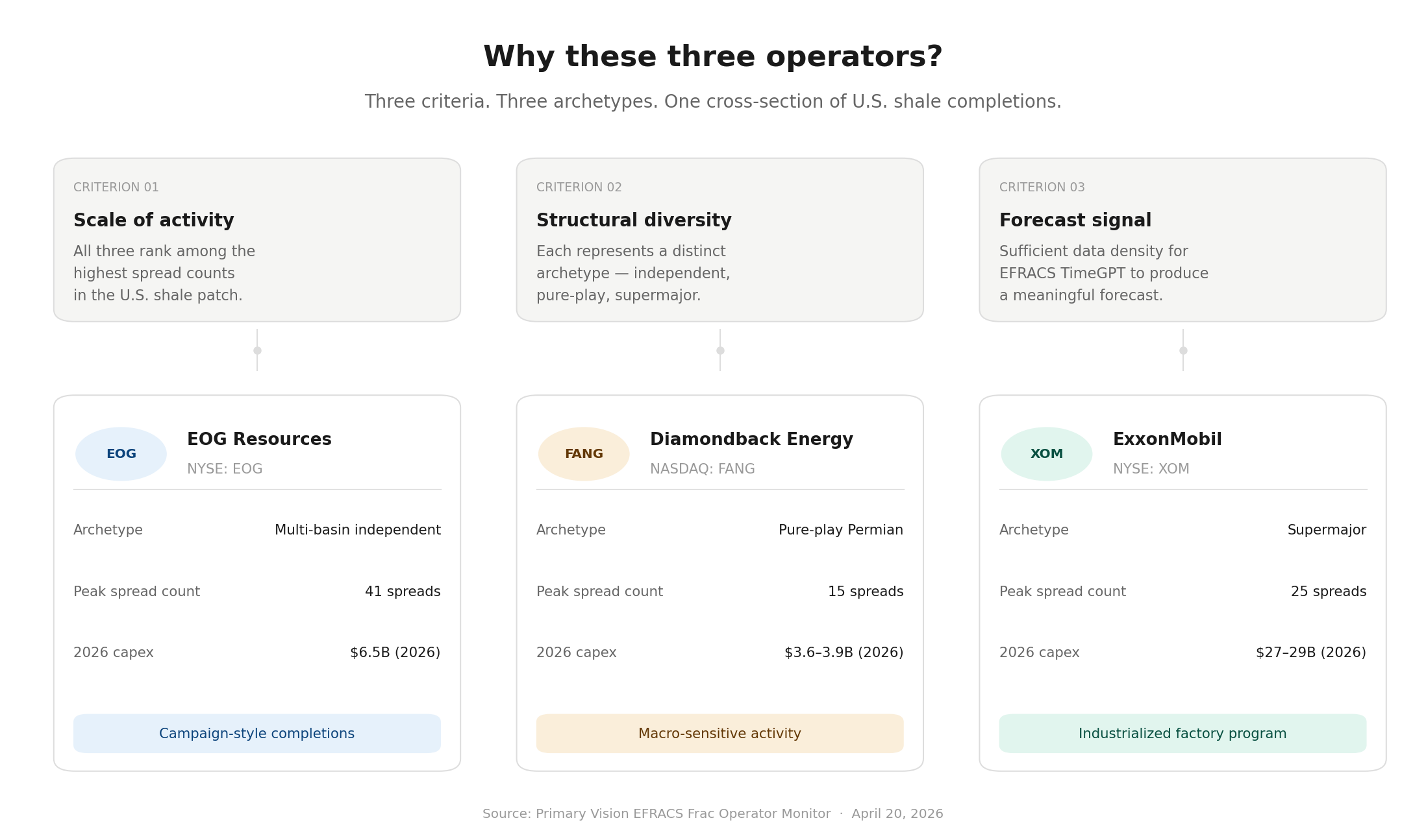 Global oil markets are in the middle of a genuine supply shock — Strait of Hormuz restrictions have cut global deliveries by over 10 mb/d, with physical crude trading near $130, $140/bbl. Higher prices were pulling U.S. shale activity up, and the data was responding — but this week that momentum stalled. The national frac spread count sits at 165, down 6 on the week and 35 year-on-year. Frac job count is 212, rig count 543, both slipping. One week does not make a trend, but it is worth watching which operators are holding the line and which are pulling back. We focused on EOG Resources, Diamondback Energy, and ExxonMobil — selected for frac activity scale, structural diversity, and forecast signal quality — using Primary Vision's EFRACS Frac Operator Monitor.