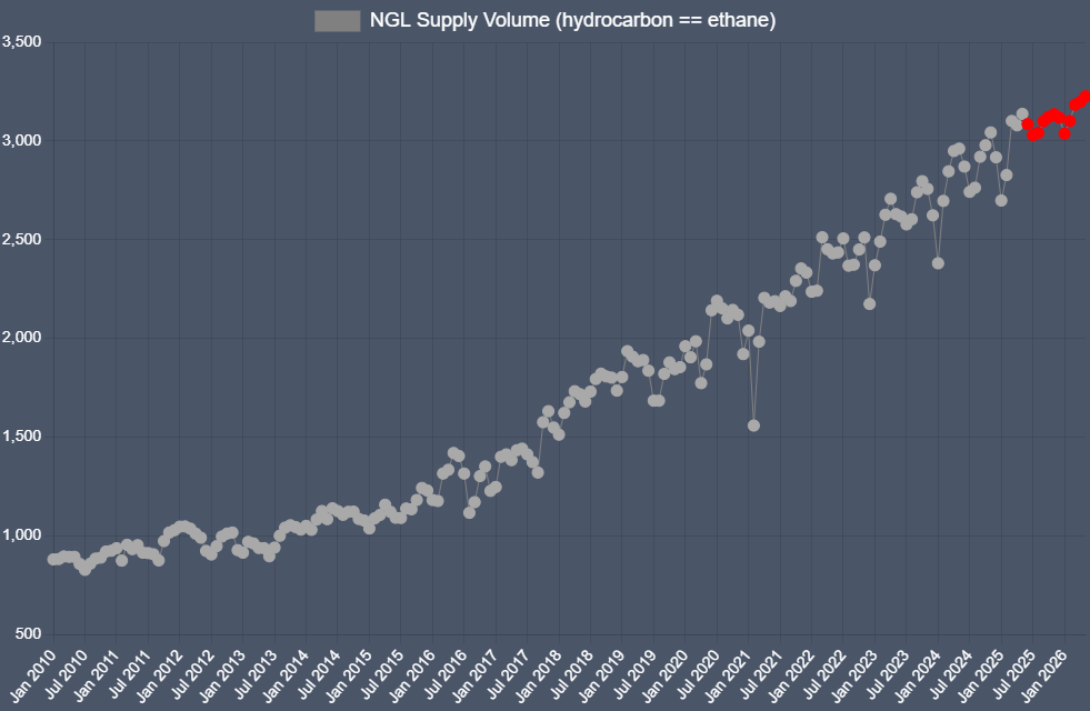 But the aggregated line masks very different stories inside the barrel. Ethane, the largest NGL by volume, is stable through year-end. Our NGL supply portal shows that it will hold near 3,100 MBbl/d from September through December, showing little movement. According to the EIA, U.S. ethane consumption is expected to hold at approximately 2,300 MBbl/d in both 2025 and 2026, with supply rising from ~2,900 MBbl/d in 2025 to ~3,100 MBbl/d in 2026. Exports provide the growth outlet, climbing from ~530 MBbl/d in 2025 to ~630 MBbl/d in 2026.