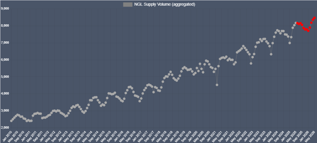 Natural gasoline (C5+), by contrast, is where the real seasonality shows up. Supply contracts hard into the winter, falling from ~925 MBbl/d in September to just ~828 MBbl/d by January 2026. The drop comes because C5+ is primarily used as a diluent and for gasoline blending, both of which see weaker demand in the colder months. That dip is sharper than anything we see in ethane or propane and weighs heavily on the aggregate supply line through late 2025. But the decline is temporary. By spring, volumes rebound to more than 900 MBbl/d, reflecting the return of blending demand as driving season ramps up, helping fuel the aggregate recovery above 8,400 MBbl/d.