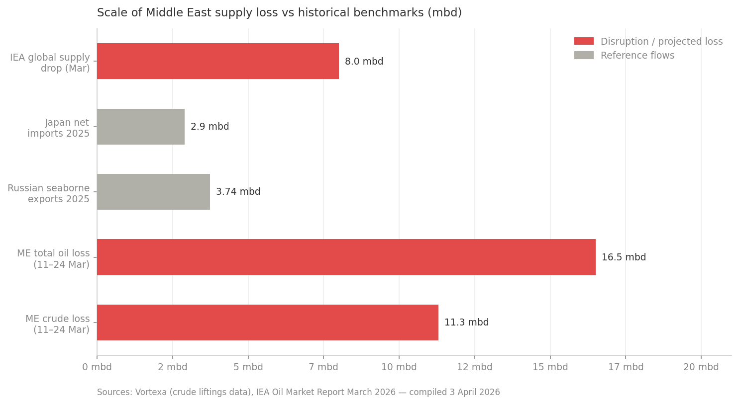 The reality, when you look at it plainly, is severe. The IEA has described this as the largest supply disruption in the history of the global oil market, with Gulf countries having cut total oil production by at least 10 million barrels per day as crude and product flows through the Strait of Hormuz plunged from around 20 mbd to a trickle. Global oil supply is projected to fall by 8 mbd in March, with curtailments in the Middle East only partly offset by higher output from non-OPEC+ producers. Strategic petroleum reserve releases from IEA member nations — a coordinated release of 400 million barrels agreed on March 11 — provide a meaningful but explicitly temporary buffer.