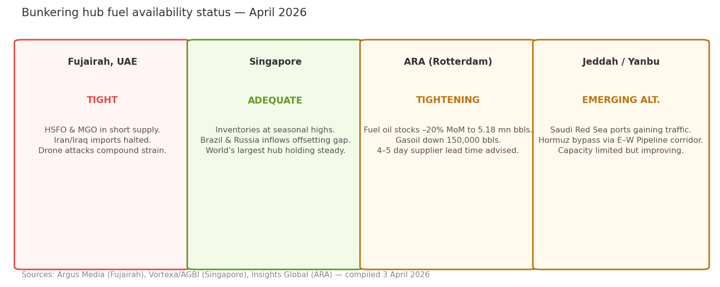 What makes this moment particularly complex for anyone managing fuel procurement is the growing divergence between where crude is priced and where physical product is actually available. The bunkering market illustrates this sharply. At Fujairah, both HSFO and MGO are in short supply, a situation compounded by the port's heavy historical dependence on HSFO imports from Iran and Iraq. Singapore, by contrast, is emerging as one of the main balancing points globally, with fuel oil arrivals from Brazil and Russia helping to offset the shortfall, keeping inventories at seasonal highs. The hub spread is widening, and that spread has real operational consequences: vessels are making longer detours to refuel, Atlantic Basin traders are redirecting cargoes eastward to capitalise on the arbitrage, and carriers are absorbing costs that BAFs were never designed to absorb at this speed.