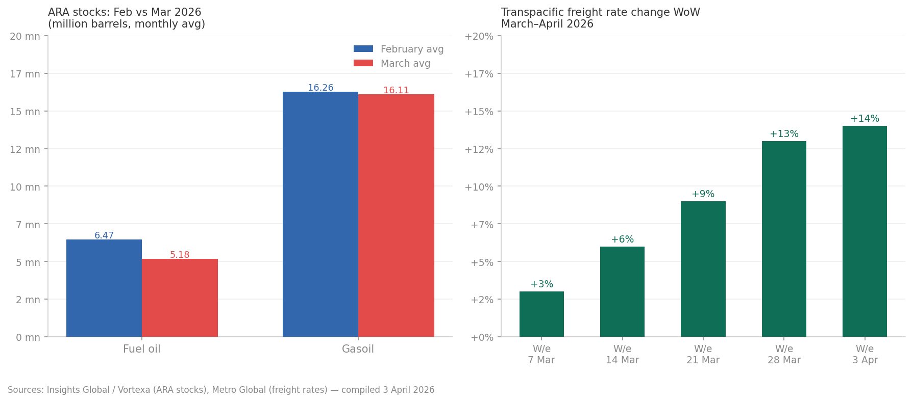 Those costs are feeding upstream into freight rates. On the transpacific, rates have increased by approximately 12–14% week-on-week, driven primarily by fuel cost escalation rather than demand strength, and analysts suggest that rates would need to rise by around 15% to fully offset current fuel cost increases. In the ARA region, the picture is also tightening. Data shows fuel oil stocks have declined 20% in March, slipping 1.29 million barrels to 5.18 million barrels on a monthly average basis, while gasoil inventories dropped 150,000 barrels to 16.11 million barrels. Imports of fuel oil into the region fell from 192,000 b/d in February to approximately 160,000 b/d in March, per Vortexa tracking. Suppliers at the ARA bunkering hub are advising buyers to plan for four to five days of lead time to secure reliable coverage — a modest operational adjustment today, but one worth taking seriously given the trajectory.