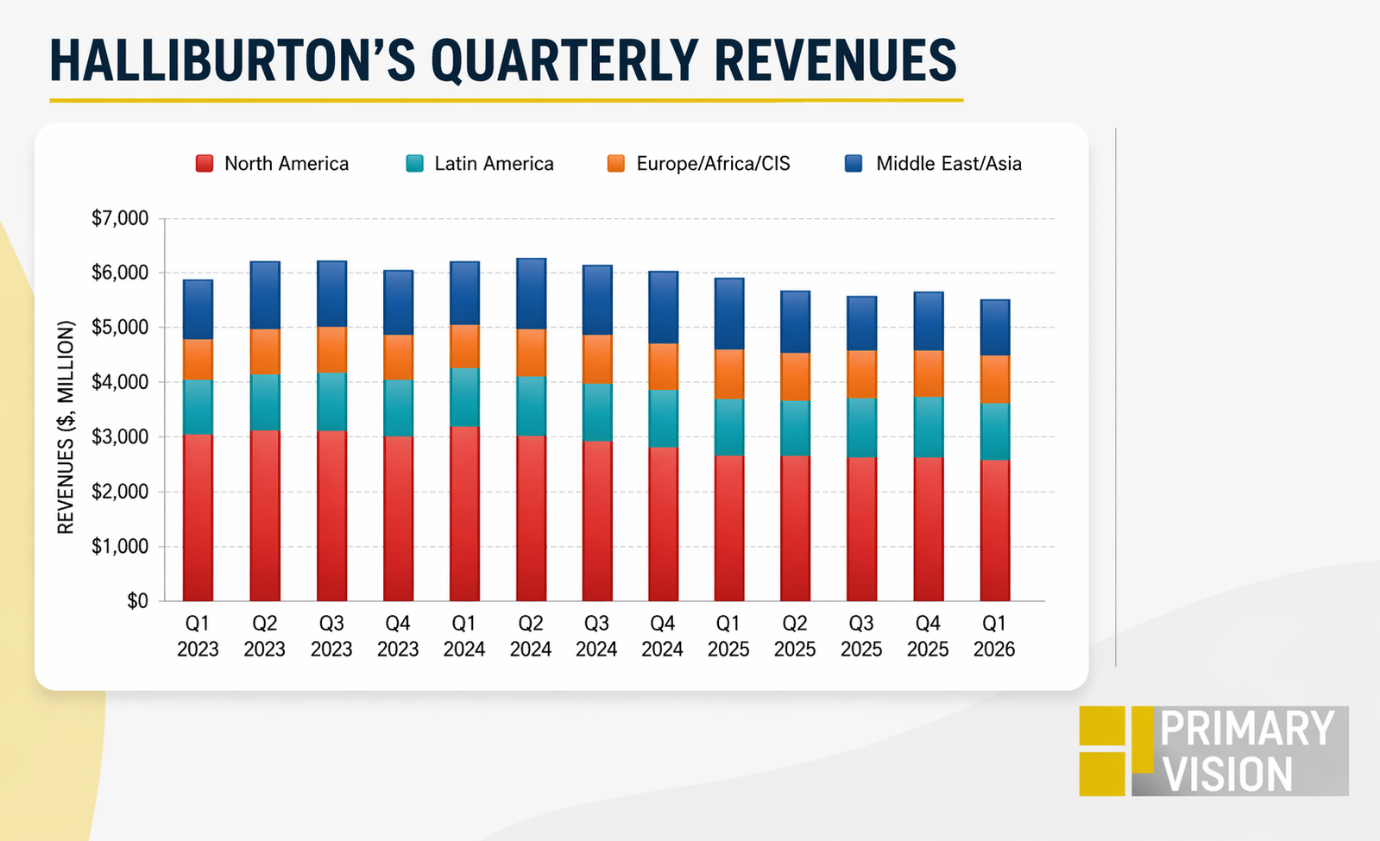 It highlighted weaker stimulation (frac) activity in North America, which was a key driver behind the decline in Completion & Production performance. It also pointed to reduced pressure pumping services in the Middle East, reinforcing that completions demand remains uneven globally. On the positive side, pressure pumping activity improved in Africa. HAL’s net income declined sequentially by ~22% in Q1, reflecting the absence of Q4 tax benefits and slightly weaker activity levels.