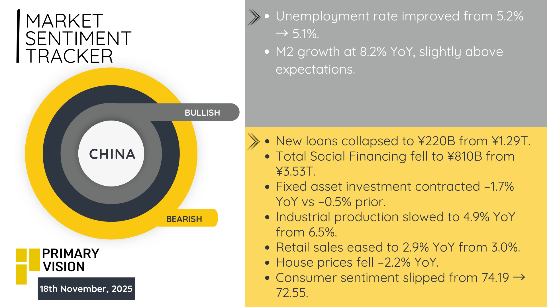 China’s latest batch of economic figures, released through November, tell a story that is weaker than the headline commentaries suggest, but not without areas of quiet resilience. The numbers show a clear slowdown: new loans dropped to 220 billion yuan in October from 1.29 trillion the month before, total social financing fell sharply to 810 billion yuan from 3.53 trillion, industrial production eased to 4.9 percent year on year from 6.5 percent, and retail sales slipped to 2.9 percent from 3.0 percent. This may look concerning on paper, yet the underlying picture is less linear than these misses imply.