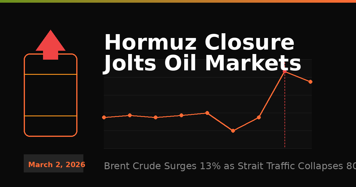 The primary driver of this volatility is the effective closure of the Strait of Hormuz, which handles approximately 20 percent of global daily oil supply. Shipping traffic through the strait declined by more than 80 percent between March 1 and March 2, with vessel tracking data confirming that tanker transits essentially ceased following Iranian strikes on commercial vessels and energy infrastructure across the Gulf region. Iran's Islamic Revolutionary Guard Corps declared the waterway closed to shipping and threatened to target any vessel attempting passage. War-risk insurance for the corridor was withdrawn over the weekend, which removed the commercial viability of transit even in the absence of direct Iranian interdiction.