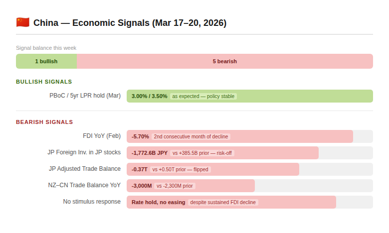 China's inward FDI fell to just $4.5 billion in 2024 — the lowest since 1991 — representing barely 1.3% of its 2021 peak, and the trajectory into 2026 has not reversed. The regional spillover is visible: Japan's foreign equity investment swung from +385.5B yen to -1,772.6B yen, and the adjusted trade balance flipped into deficit. These aren't isolated readings — they reflect a consistent withdrawal of engagement with the China-anchored regional economy. The IMF identifies policy uncertainty and geopolitical risk as the primary structural drivers of the FDI decline — neither of which a passive rate hold addresses. Beijing is holding its position while the conditions that drive capital away remain firmly in place.