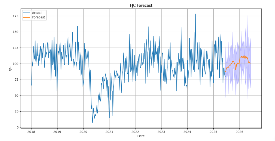 On the FJC side, the basin-level forecast data adds a dimension that the weekly actuals alone do not convey. The Permian, which printed 103 this week, is forecast to partially recover to 109 — but the yearly change of -33 is the more consequential number. This is not weekly noise; it points to a basin undergoing a structural reduction in completions intensity year-on-year, with downstream implications for associated gas volumes that remain to be fully priced into supply outlooks.