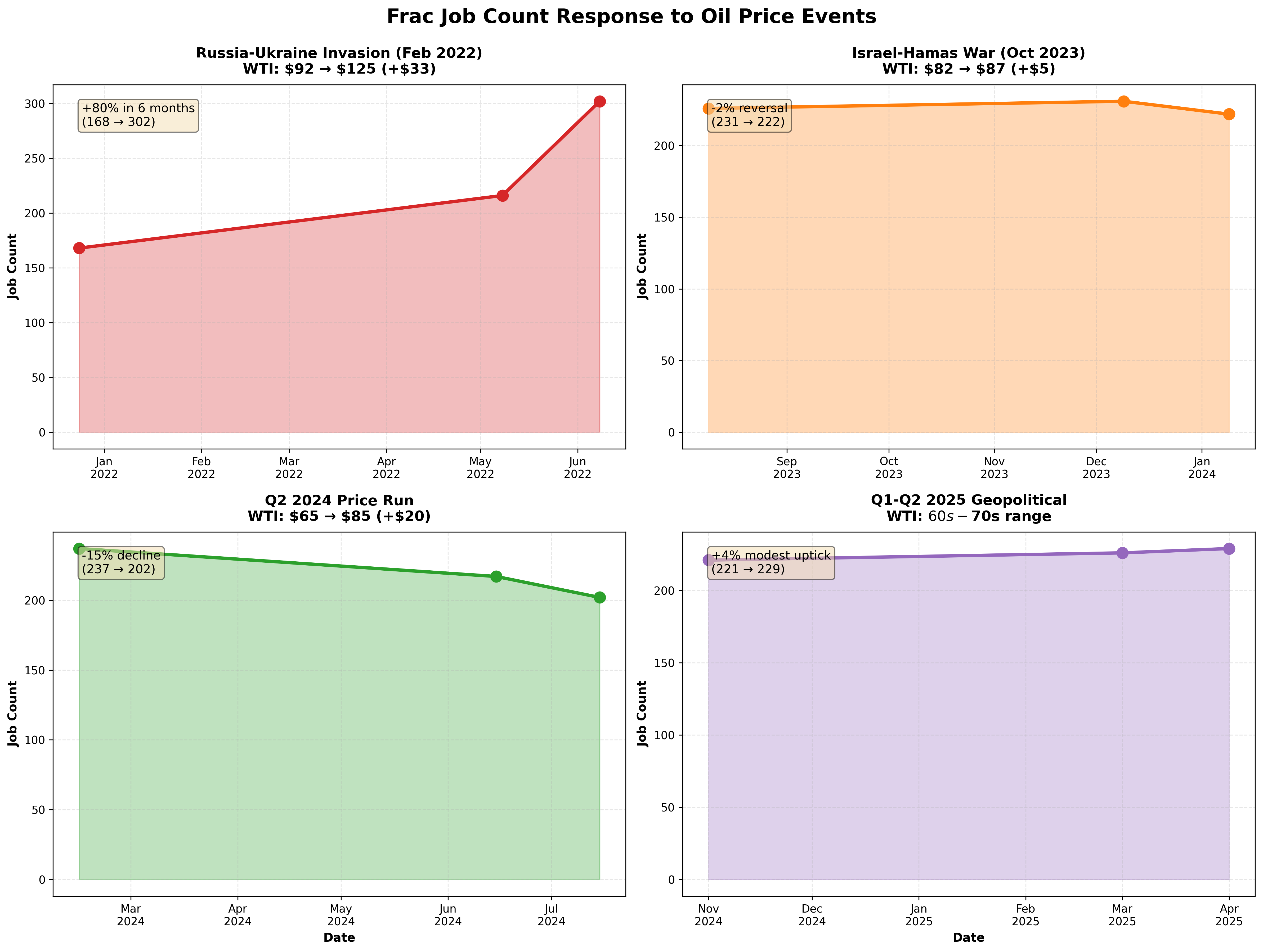 Running the same analysis on frac job count reveals an even more pronounced response pattern. When Russia invaded Ukraine in February 2022 and WTI surged from $92 to $125, job count exploded 80% over six months, climbing from 168 in late December 2021 to 302 by early June 2022. That outsized response relative to the 16% spread count increase shows operators maximized utilization of existing fleets before committing capital to add new spreads. The Israel-Hamas spike in October 2023 produced no meaningful job count response, with activity flat at 226-231 jobs through December before slipping back to 222 by January 2024 as prices faded. The 2024 spring rally actually coincided with declining job count, dropping 15% from 237 in mid-February to 202 by mid-July despite WTI climbing from $65 to $85. Job count has since stabilized in the low-220s range through early 2025, ticking up modestly to 229 by April before the current reading of 210. The pattern reinforces the same conclusion: operators gear up aggressively when prices sustain above $90 for multiple months, but ignore transient spikes regardless of magnitude. Job count responds faster and harder than spread count because utilization can flex immediately without fleet additions.
