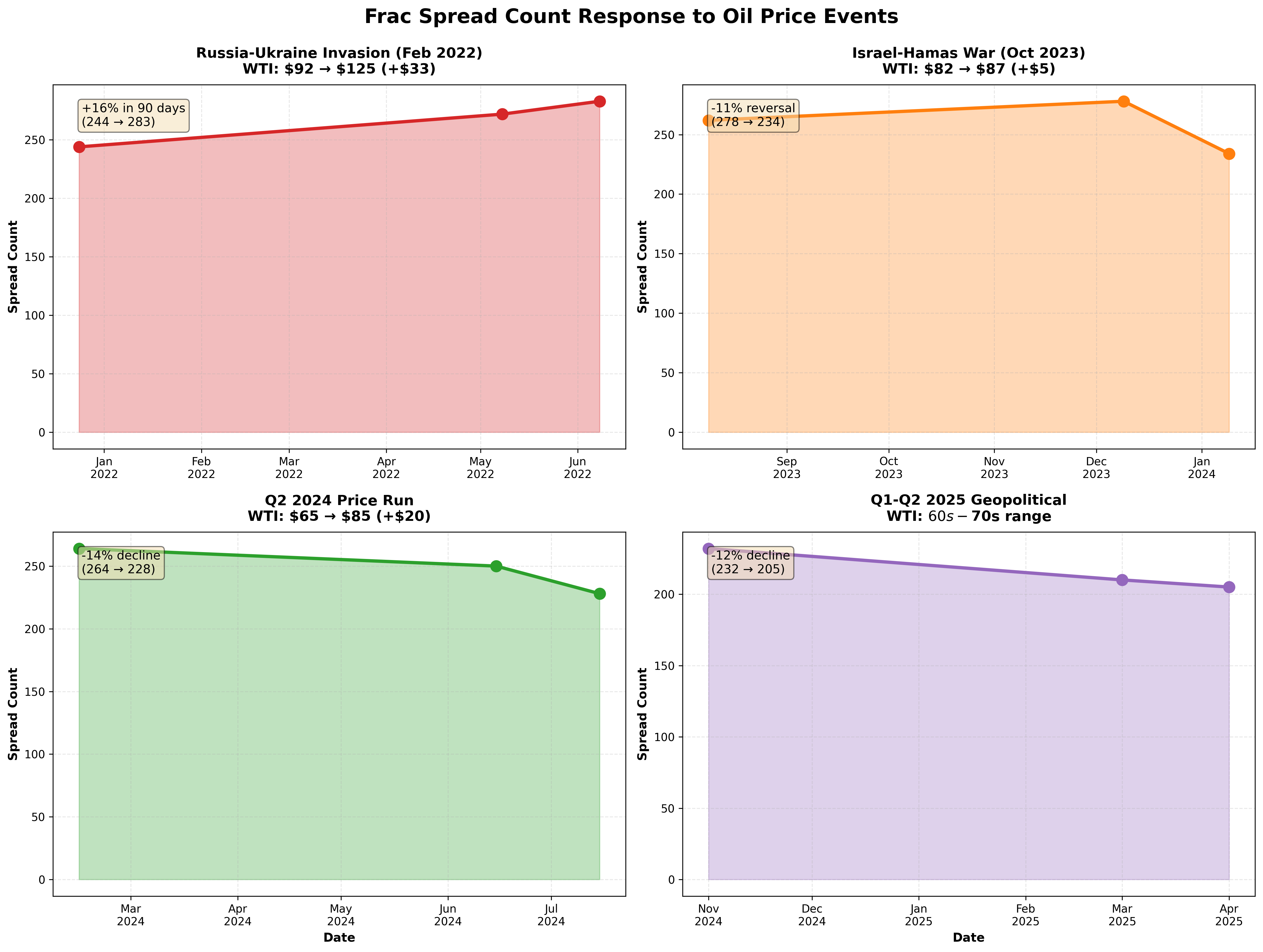 Historical data from Primary Vision shows the answer depends entirely on duration. When Russia invaded Ukraine in February 2022 and WTI surged from $92 to $125 per barrel, frac spreads climbed 16% over the following 90 days, rising from 244 in late December 2021 to 283 by early June 2022. That response reflected four consecutive months of oil trading above $100, giving operators confidence that marginal inventory would pencil. The Israel-Hamas conflict in October 2023 produced a different outcome. WTI spiked 6% from $82 to $87 but faded within days. Spreads ticked up 6% in the immediate 60-day window before collapsing 11% to 234 by January 2024 as prices rolled over. The 2024 spring rally from $65 to $85 generated zero activity response, with spreads declining 14% from 264 in mid-February to 228 by mid-July as operators maintained capital discipline. The pattern holds: sustained prices above $90 for six weeks trigger a 10-15% ramp in spread count within 90 days. Brief spikes fade without mobilizing capital.