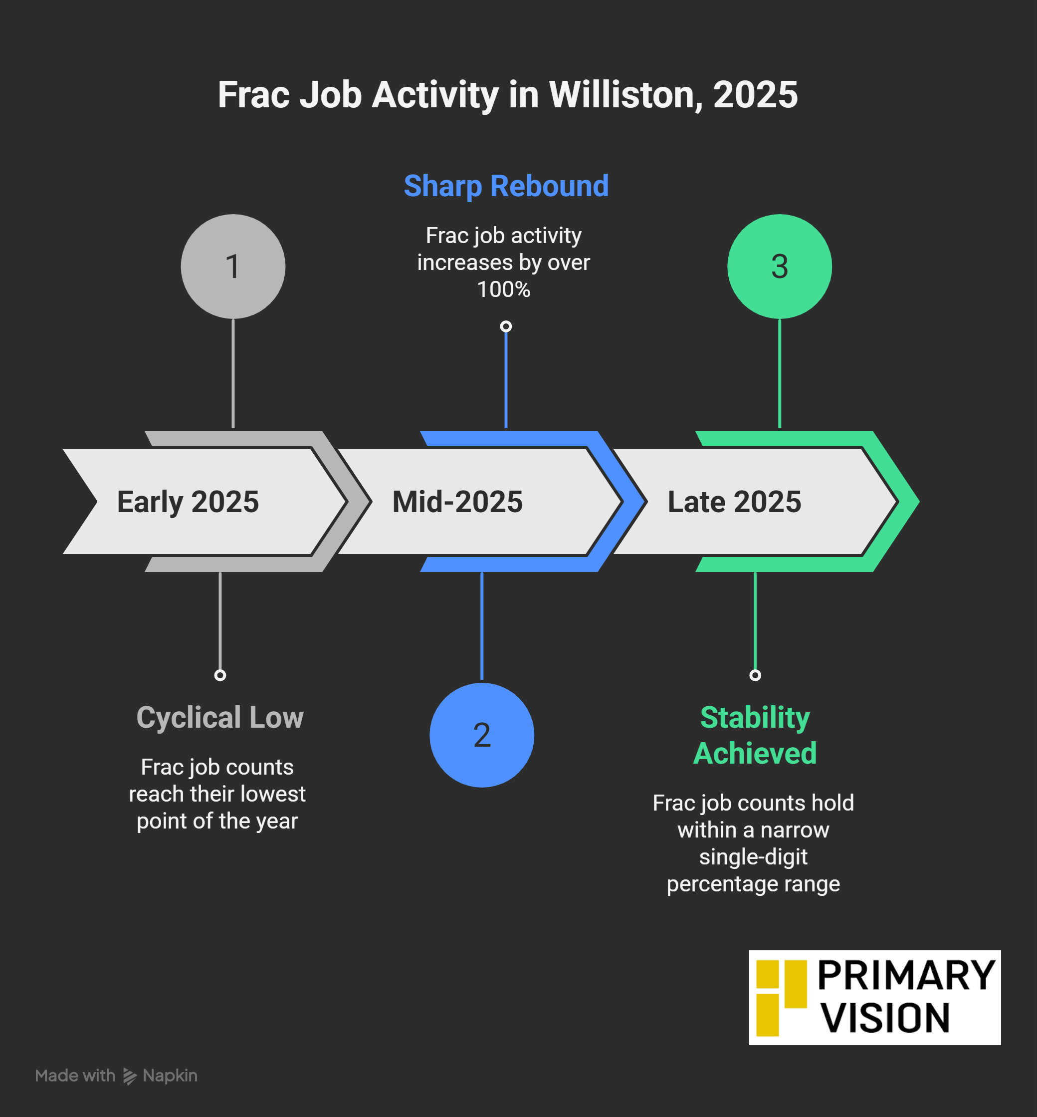 At the same time, Harold Hamm’s comments about potentially pausing drilling in the Bakken due to shrinking margins highlight the sensitivity of drilling economics to declining oil prices and rising costs have gathered a lot attention. However, it is important to distinguish between drilling decisions and completion activity already in the pipeline. Primary Vision’s data indicates that activity in the Williston Basin, which includes the Bakken, is not only holding up but has shown signs of incremental growth on the completion side.