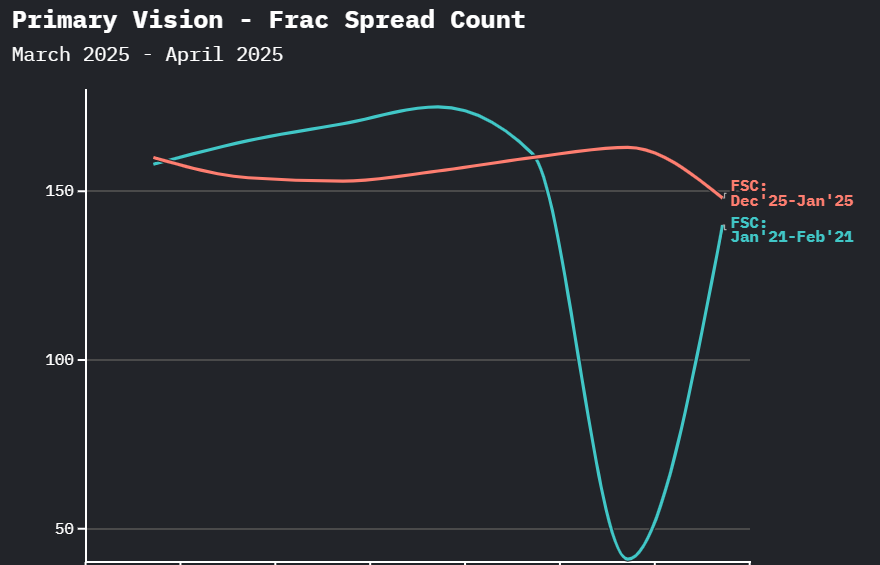 The latest weekly update from Primary Vision shows a sharp decline in U.S. frac activity, with both the Frac Spread Count and the Frac Job Count posting significant week-over-week losses. As of the most recent release, the Frac Spread Count stands at 148, down 15 on the week, while the Frac Job Count declined to 188, also down 15. These changes are larger than typical weekly movements and require contextual interpretation to avoid overstating their significance.