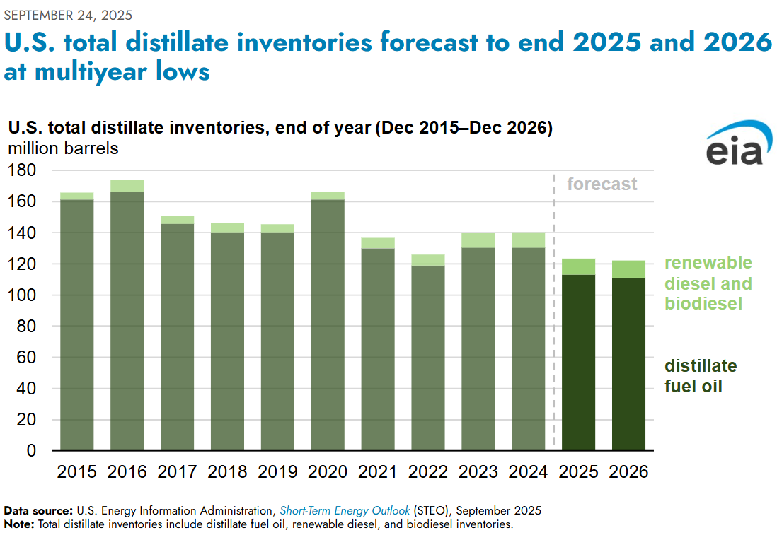 Another misconception that I want to highlight before ending this week's note is the assumption that low distillate stocks are a simple result of strong domestic demand. In reality, the situation is far more complex. U.S. total distillate inventories are expected to end both 2025 and 2026 at multiyear lows, reflecting a sharp 17% drawdown, about 22 million barrels, in the first half of 2025. That drawdown was driven in large part by a steep drop in renewable diesel and biodiesel availability, which fell by 35% year on year. The resulting supply gap increased demand for petroleum-based distillate by roughly 170,000 barrels per day, while exports of distillates averaged 1.2 million barrels per day, about 7% above the five-year average, pulling even more product out of domestic storage. Structural constraints on refining capacity have also played a significant role. The closure of LyondellBasell’s Houston refinery earlier this year, and two more closures planned in California, are reducing domestic production of petroleum products and limiting the ability to rebuild inventories.