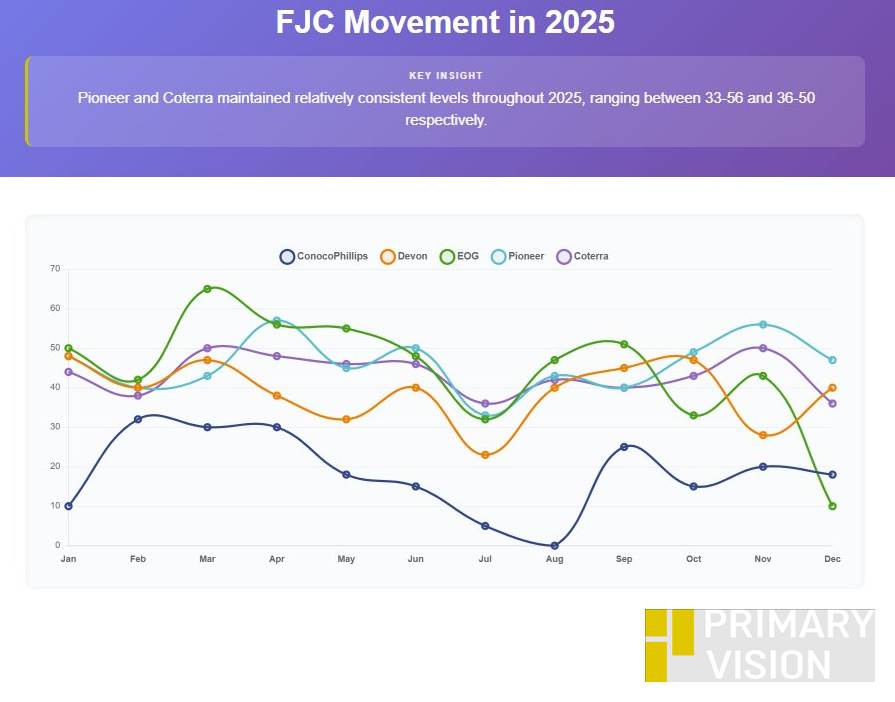 According to Primary Vision’s frac job count estimates, in 2025, Pioneer and Coterra demonstrated the most consistent performance patterns. EOG experienced notable fluctuations, particularly in the final quarter.