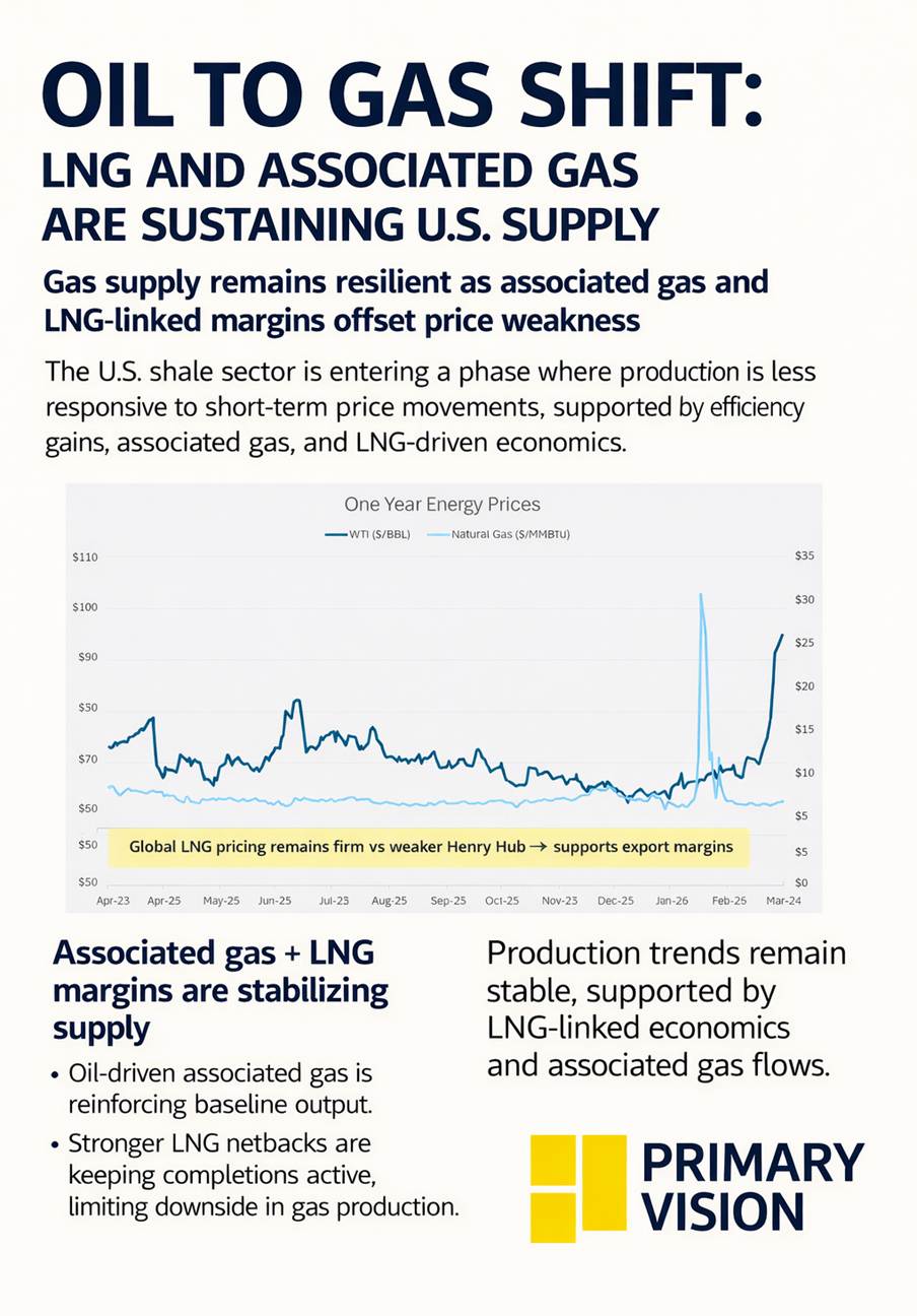 Taken together, these trends suggest the U.S. shale system has become structurally less responsive to commodity price swings. Oil producers continue to deliver modest growth, while gas producers maintain relatively stable output despite significant price declines. Meanwhile, associated gas from oil drilling reinforces overall supply.