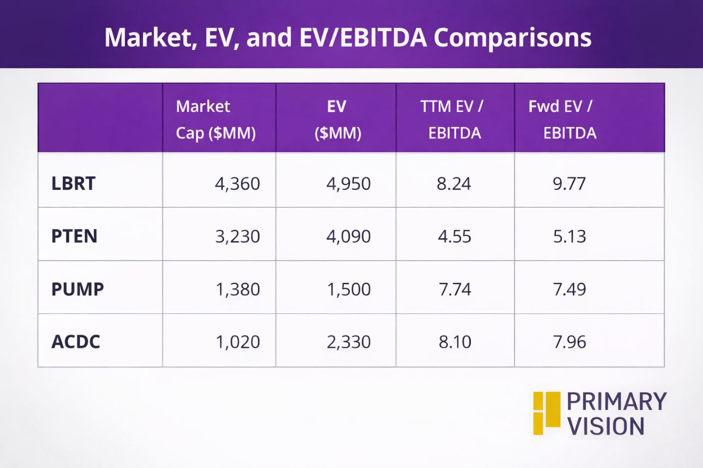 LBRT's forward EV/EBITDA multiple expansion versus the current EV/EBITDA is higher than its peers because the company's EBITDA is expected to decline more steeply than its peers in the next four quarters. This typically results in a lower EV/EBITDA multiple than peers. The stock's EV/EBITDA multiple is higher than its peers' (PTEN, PUMP, and ACDC) average of 6.8x. So, the stock appears to be overvalued compared to its peers.