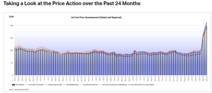 Fuel accounts for 25–30% of an airline's total operating expenses. Not labor, not aircraft, not airport fees — fuel. That means movements in crude oil prices translate directly into airline profitability, ticket pricing, and cargo rates. To illustrate the scale, one large North American carrier spent roughly over $11 billion on jet fuel in 2025 alone. The market is currently under significant pressure. Prices spiked to approximately $175–$197 per barrel in early 2026 — a jump of over 120% within weeks driven by escalating Middle East conflict disrupting shipping routes and widening refinery crack spreads globally. This follows a relatively stable 2025 when prices averaged $87–91 per barrel.