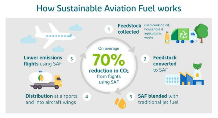 The emerging alternative is SAF (Sustainable Aviation Fuel), produced from feedstocks like agricultural waste, cooking oil, and ethanol. It can be blended with conventional jet fuel and produces lower emissions. However, it currently covers just 0.6% of global jet fuel consumption and costs two to four times more than conventional fuel. The direction is clear the scale is not there yet.