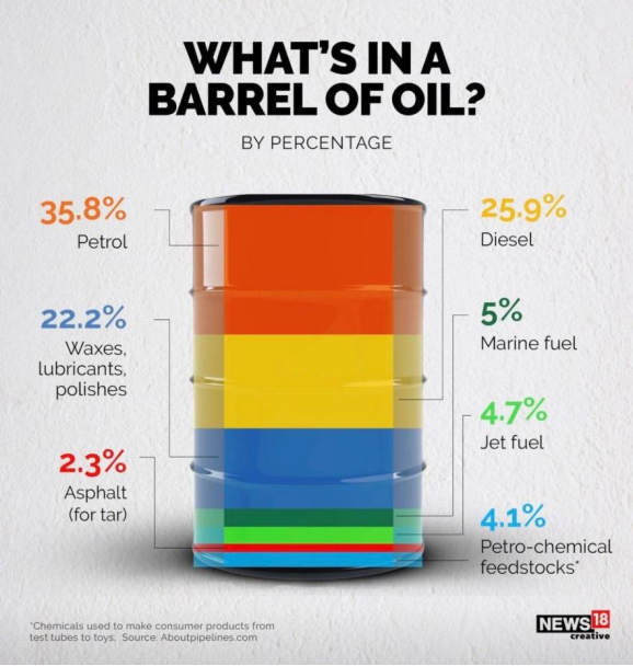 Crude oil comes out of the ground as a raw, unusable mixture. Before it becomes anything useful, it has to be processed at a refinery. The refinery heats the crude oil and at different temperature ranges, different products separate out gasoline comes off first, then jet fuel in the middle, then diesel, then heavier products like heating oil and asphalt toward the bottom.
