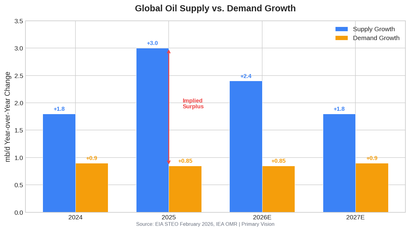 The headline narrative points toward oversupply. The EIA's February Short-Term Energy Outlook forecasts Brent averaging $58 per barrel in 2026, with global inventory builds of around 3.1 million barrels per day—more than in 2025. The IEA projects supply growth of 2.4 million barrels per day against demand growth of just 850,000. On paper, that is a significant imbalance. But the picture is more complicated than the headline numbers suggest. Saudi Aramco's CEO Amin Nasser recently dismissed the glut narrative as 'seriously exaggerated,' noting that global stocks remain below the five-year average and that much of the oil is sitting on water—roughly 1.3 billion barrels according to Kpler—consists largely of sanctioned barrels from Russia, Iran, and Venezuela that struggle to find buyers through conventional channels.