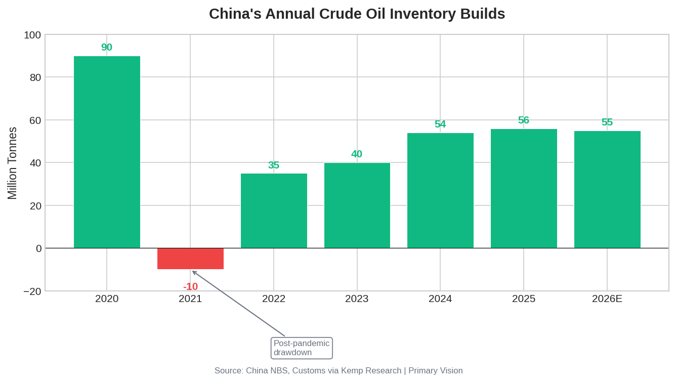 This is where China enters the picture. In 2025, China imported a record 11.6 million barrels per day of crude, up nearly 5% year-over-year. But here is the important detail: a significant portion of that increase went into storage rather than immediate consumption. According to analysis by John Kemp, China's crude inventories increased by around 54 million tonnes—roughly 400 million barrels, or about 1.1 million barrels per day—during 2025, following a similar build in 2024. The IEA estimates Chinese crude stocks rose by 111 million barrels over the course of last year. In effect, China acted as a substantial buffer, absorbing much of the global surplus that might have otherwise weighed more heavily on prices.