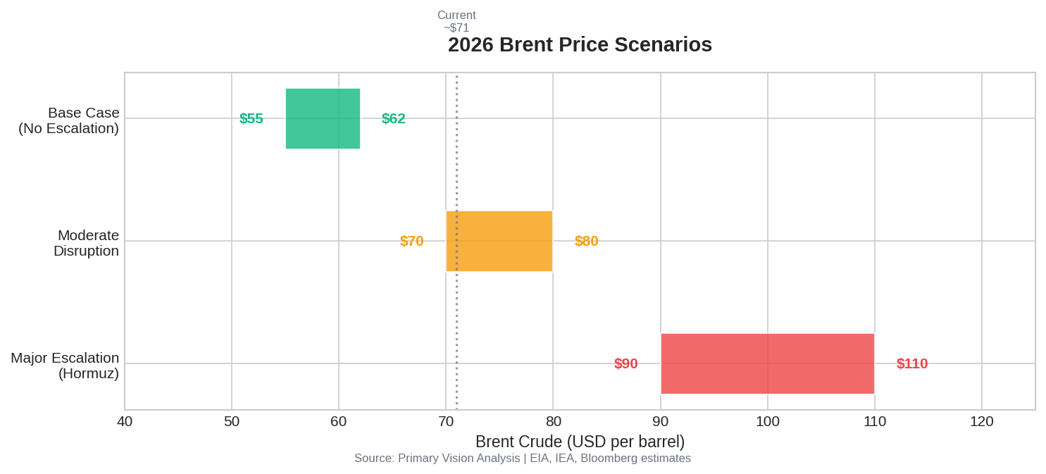 Thinking through scenarios, the range of potential outcomes is fairly wide. In a base case with no major escalation, continued oversupply, and China maintaining its stockpiling pace, Brent would likely settle in the $55-62 range through the year—broadly consistent with EIA projections. If sanctions tighten further or a supply disruption removes 1-2 million barrels per day from the market, prices could move into the $70-80 range, though strategic reserve releases might offset some of the impact. A major escalation involving the Strait of Hormuz—a scenario we have explored in previous articles—would be a different situation entirely, with prices potentially reaching $90-110 or higher.